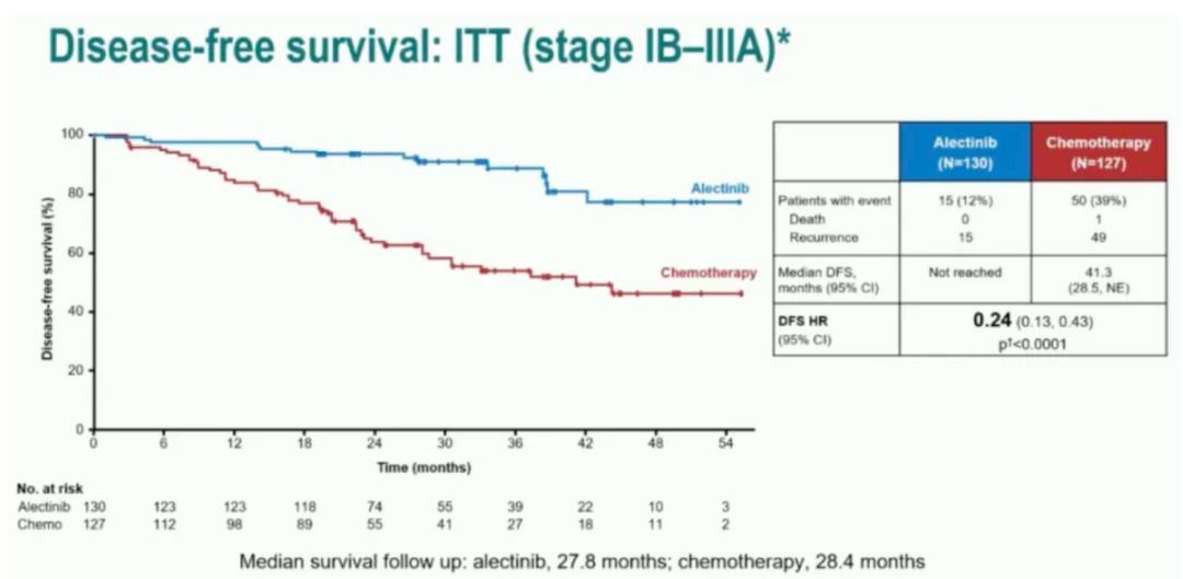 我们知道ADAURA等研究开启了NSCLC辅助靶向治疗的序幕,主要针对常见突变基因EGFR的患者。那么在罕见突变领域,2023年ESMO报道的3期ALINA研究也取得了重要突破,阿来替尼用于ALK突变NSCLC患者(IB-IIIA期)术后辅助治疗,可相较于化疗显著降低76%的疾病复发和死亡风险(DFS:NR vs 41.3个月,HR 0.24,P<0.001)。目前,罕见突变的晚期NSCLC领域已经有非常丰富的新型靶向治疗药物,按照ALINA、ADAURA这些研究的模式,未来或许会有更多的靶向治疗药物可用于罕见突变NSCLC患者的早期治疗,使更多患者获得治愈。