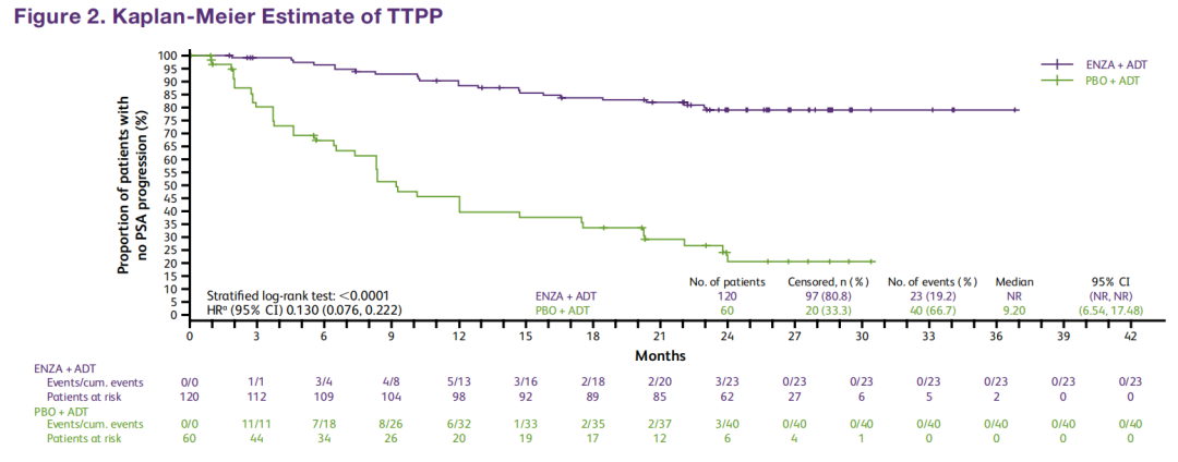 研究显示达到了主要终点:恩扎卢胺组的PSA进展风险显著降低87%(TTPP:HR 0.130,P<0.0001)。