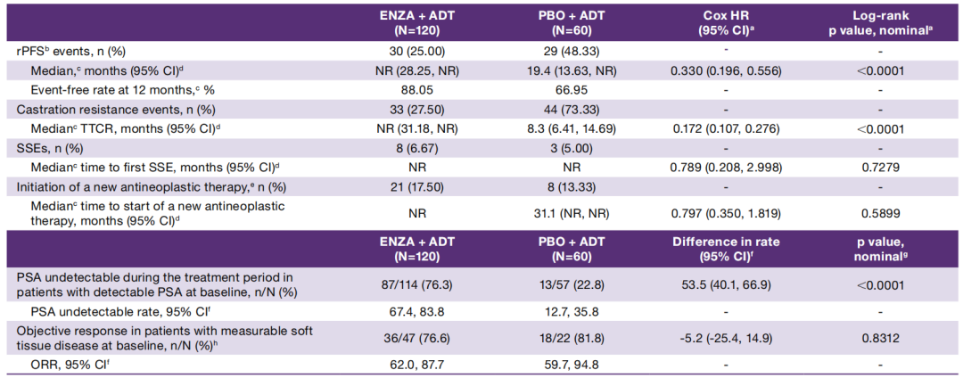 在次要终点方面,恩扎卢胺组的影像学疾病进展风险降低67%(rPFS:NR vs 19.4个月,HR 0.330,P<0.001),去势抵抗风险降低82.8%(TTCR:NR vs 8.3个月,HR 0.172,P<0.001),PSA降低至不可检测水平的比例高达76.3%,较对照组的22.8%显著提高53.5%;该研究中对照组有23例患者交叉至恩扎卢胺组,如果考虑此类揭盲事件的话,恩扎卢胺组的至首次新抗肿瘤治疗风险则显著降低78.5%(HR 0.214)。