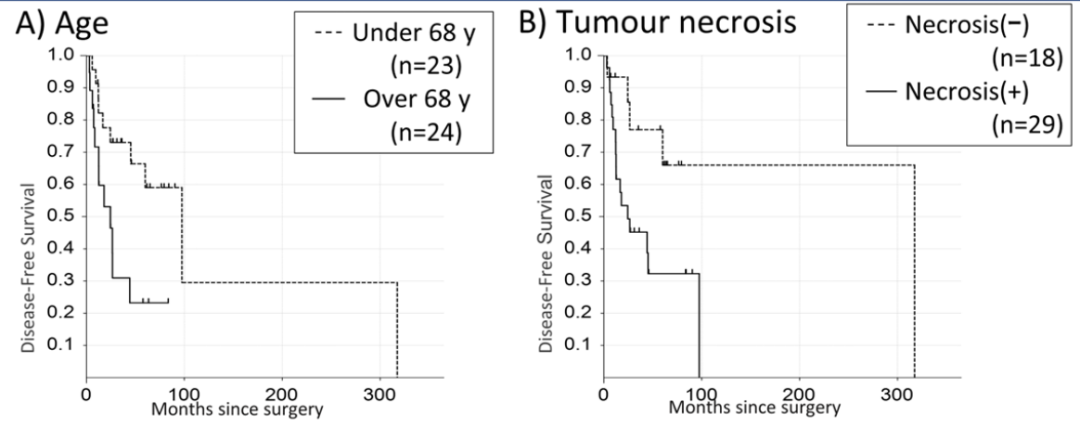 魏强教授:肾癌辅助治疗领域最近取得了显著进展。其中KEYNOTE-564是首个取得阳性结果的肾癌辅助免疫治疗3期研究,2021年ASCO报道随访24个月的数据[1],帕博利珠单抗组疾病进展风险降低32%(HR 0.68,P=0.001);2024年ASCO-GU大会报道随访57个月的数据[2],达到了关键次要终点,即OS有显著改善(HR 0.62,P=0.0024),DFS获益与此前一致(HR=0.72)。我们知道,KEYNOTE-564入组患者包括M0和M1且无疾病证据(NED)的患者,其中80%的患者为M0期中高危患者(任何核级,pT3N0M0),但目前尚不清楚哪些M0中高危患者可能是帕博单抗辅助治疗的优势获益人群,从而能够最大限度降低复发风险。本次EAU大会报道的一项研究(摘要号:P143)[3],分析了KEYNOTE-564研究中M0中高危患者的复发风险因素。多变量分析显示,年龄≥68岁(HR 2.87;P<0.026)和坏死(HR 3.28;P<0.038)是复发风险的独立预测因子。并且,年龄≥68岁(24.46个月vs.97.54个月,P=0.017)、坏死(24.43个月vs.317.5个月,P=0.023)与较短的DFS相关。