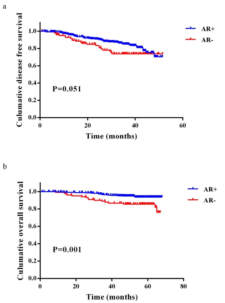 图2.根据AR表达HER2+非转移性IDC患者的生存率。根据AR表达,乳腺癌患者的DFS(a)和OS(b)的Kaplan-Meier曲线。