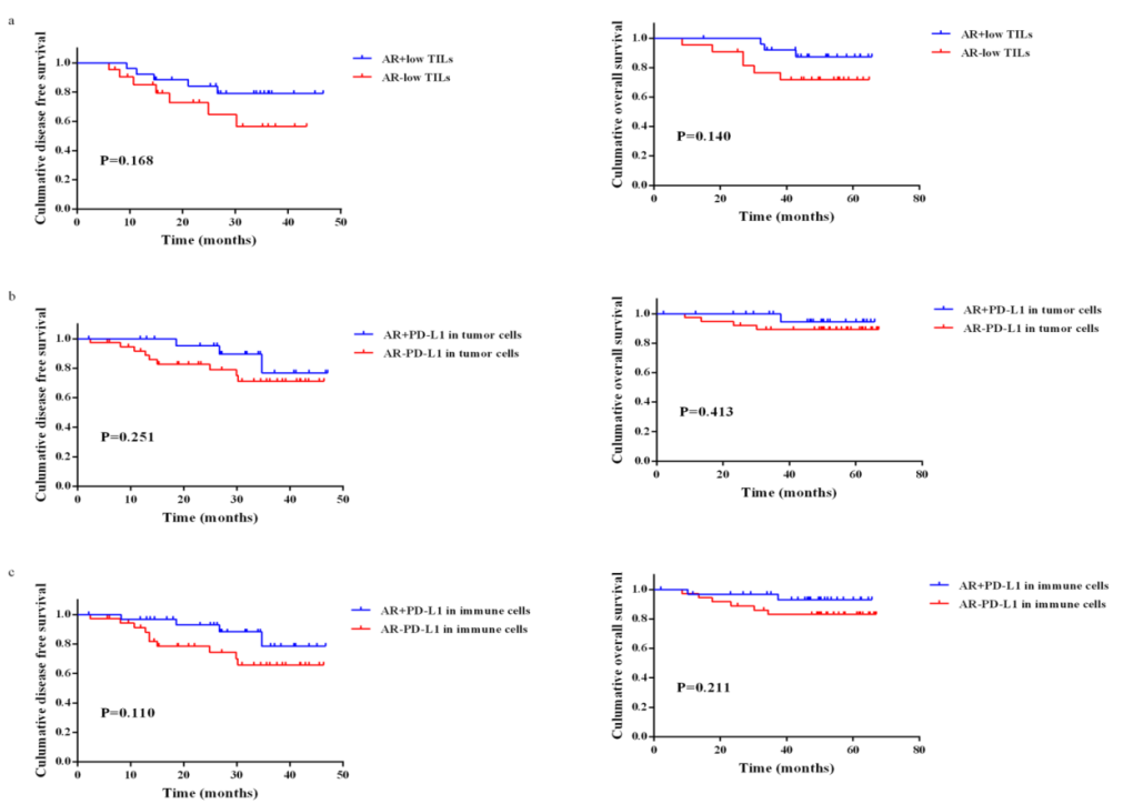 在低TILs患者中(cut off值为中位值30%)中,AR表达水平高的患者比AR表达水平低的患者更有可能具有更长的DFS(P=0.168)和OS(P=0.140)。低TILs且AR阳性患者,DFS和OS较长;肿瘤细胞或者免疫细胞PD-L1+且AR阳性患者,DFS和OS均较长。