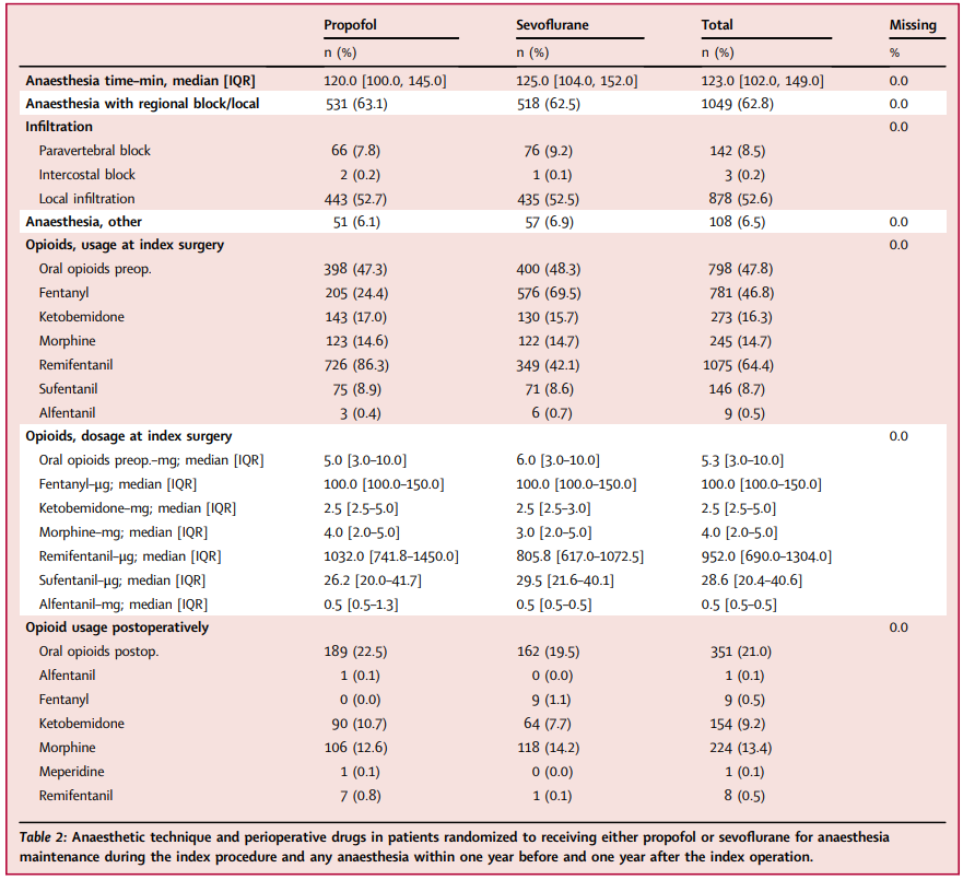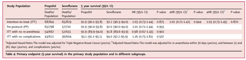 该研究为一项随机、开放标签、单盲、多中心、两国研究,于审查手术方案前或麻醉访视前由主要研究者、麻醉师或外科医生筛选患者。患者入组标准包括:年满18岁;任意性别;按计划如期治疗;可治愈;原发性浸润性乳腺癌;接受全麻(有无局麻均可)。排除急诊手术、姑息性手术、原位癌、禁忌症、以及研究者认为不适合纳入的患者。患者按照1:1随机分为丙泊酚组和七氟烷组。丙泊酚组使用丙泊酚诱导和全身麻醉维持;七氟烷组使用丙泊酚诱导七氟烷维持。术中伴随用药以及术后辅助治疗根据各中心规定执行,不允许术中使用N2O。主要结果为5年总生存(OS),次要结果1年OS。