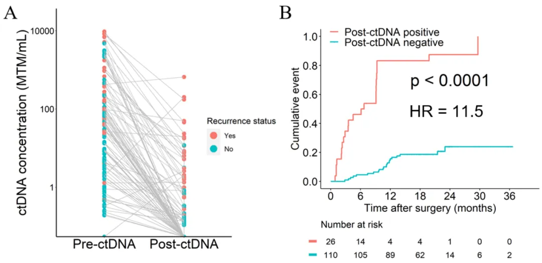 于2019至2021年间前瞻性入组136例接受根治性手术治疗的肝细胞癌患者。分别于手术前、术后1个月及后续监测期间收集血浆样本。中位随访期为24个月,共采集625份血浆样本。通过对肿瘤组织的全外显子测序识别每位患者肿瘤中的特异性体细胞突变,从中选取16个主克隆突变,使用超高深度测序对术后ctDNA进行监测,以评估术后MRD。