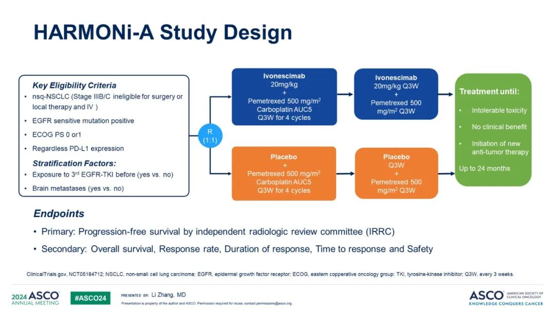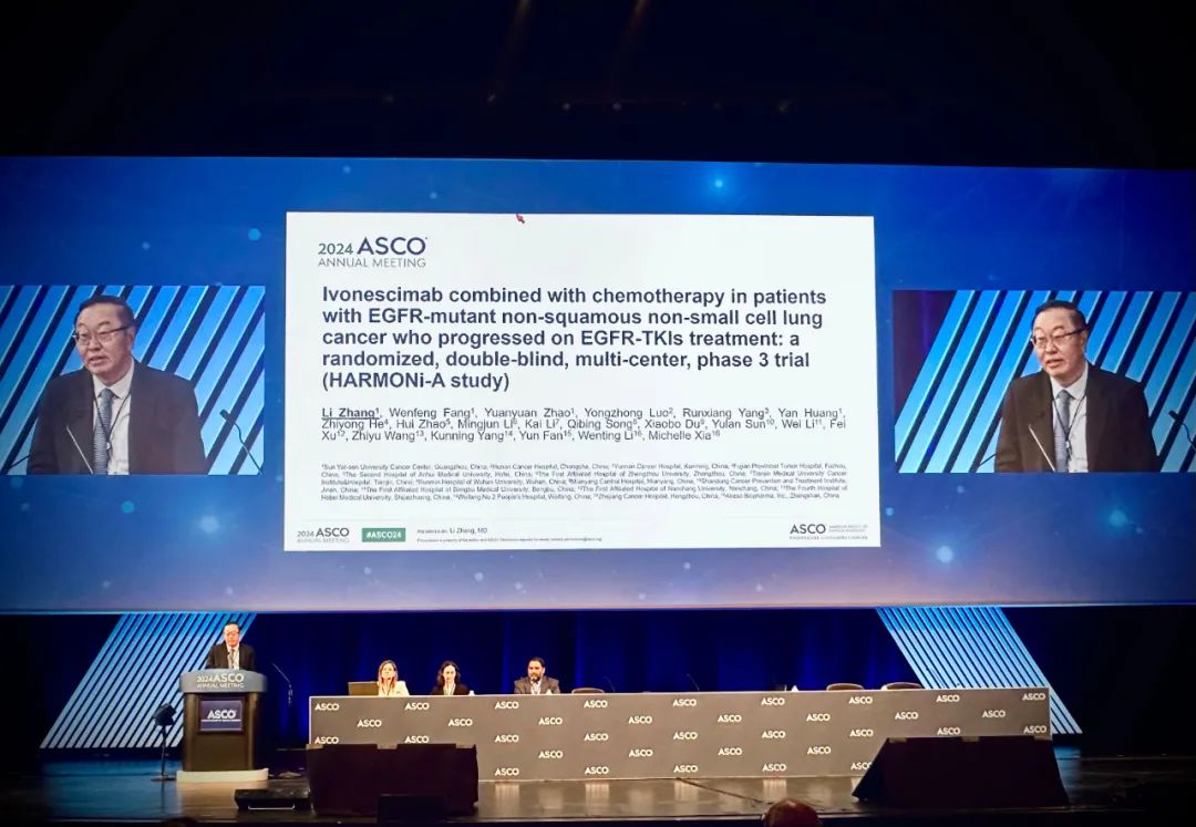 在2024 ASCO年会上,中山大学肿瘤防治中心张力教授报告了来自中国的随机HARMONi-A试验:靶向PD-1和VEGF在研双特异性抗体依沃西单抗(Ivonescimab)显著降低了经靶向治疗后病情进展的转移性EGFR突变型非小细胞肺癌(NSCLC)患者的疾病进展或死亡风险。这项双盲III期试验的结果同时发表在JAMA期刊上。本文介绍HARMONi-A试验主要结果、ASCO专家点评以及张力教授的解读。