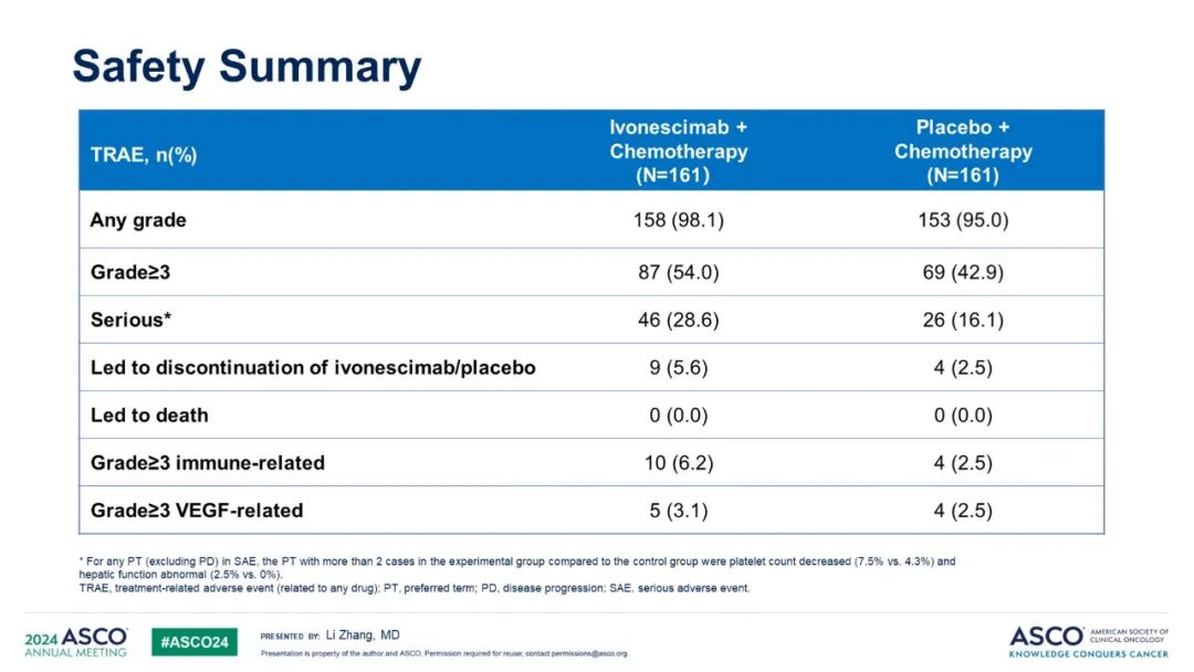 安全性总体上是可控的,没有任何意外的安全事件,治疗中断率也较低。依沃西单抗组的≥3级不良事件(AEs)和严重AEs较对照组更多,最常见的不良事件包括中性粒细胞计数、白细胞计数和血小板计数下降;以及贫血。大多数不良事件是由化疗引起的。≥3级免疫相关不良事件(6.2%vs安慰剂组2.5%)和≥3级VEGF相关不良事件(分别为3.1%vs 2.5%)的发生率较低。AEs导致停用依沃西单抗或安慰剂的发生率为5.6%和2.5%。
