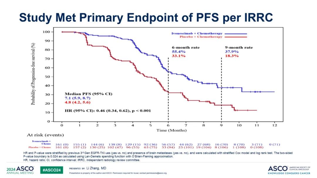 中位无进展生存期(PFS)从标准铂类化疗+安慰剂的4.8个月改善到化疗+依沃西单抗的7.1个月(HR=0.46,95%CI:0.34-0.62,P<0.001)。