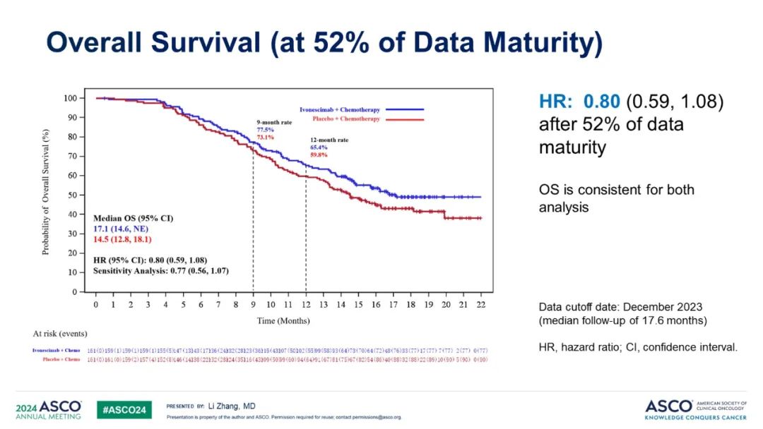 此外,总生存(OS)有提高的趋势,OS曲线分离随着时间的推移一直保持。在数据成熟度为52%时,依沃西单抗组的中位OS达到17.1个月,而对照组为14.5个月(HR=0.80,95%CI:0.59-1.08),差异未达到统计学显著性。