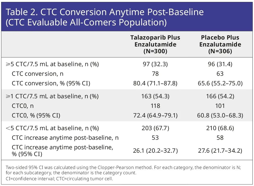CTC变化率和CTC0在TALA+ENZA组(80%与72%)较PBO+ENZA组(66%与61%)更高。