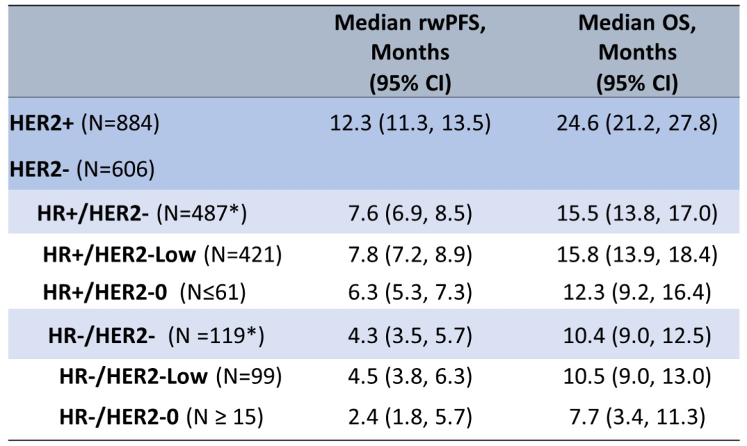 在HER2+患者中,开始T-DXd治疗后的rwPFS和OS分别为12.1个月和26.0个月;一线或二线治疗患者的rwPFS为14.9个月,三线、四线和≥5线治疗的rwPFS则为14.1个月、12.4个月和10.8个月。在HER2-患者中,中位rwPFS和OS分别为6.3个月和15.5个月;一线或二线治疗患者的rwPFS为8.1个月,三线、四线和≥5线治疗的rwPFS则为6.0个月、6.9个月和6.2个月。按照HER2和HR状态分层的T-DXd治疗rwPFS和OS如下表所示。
