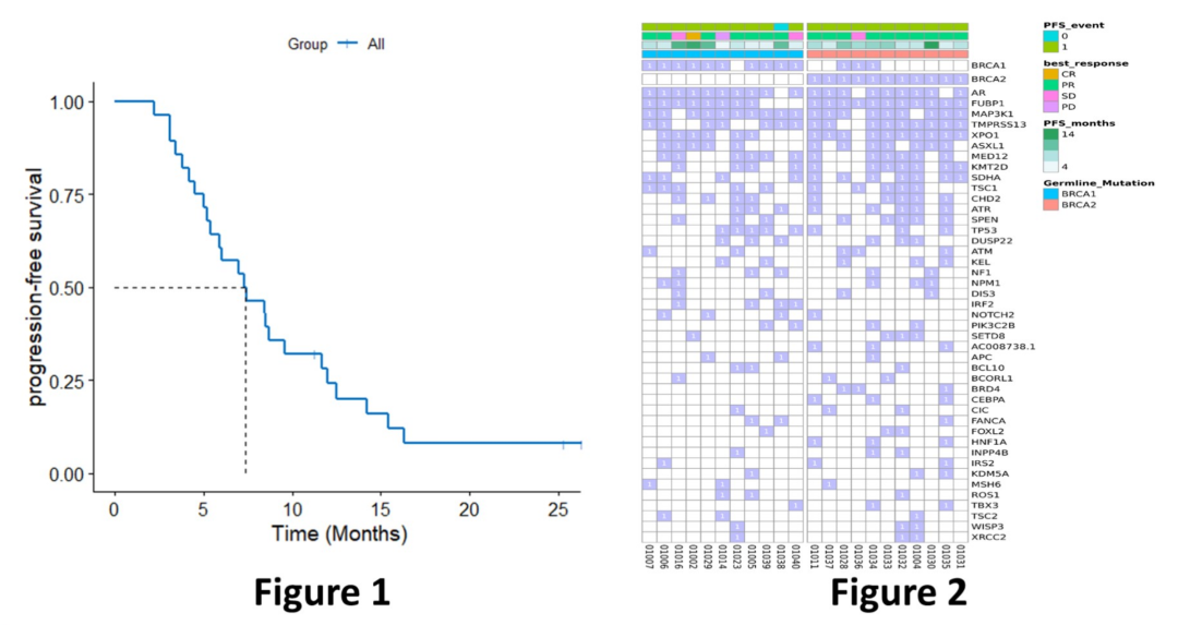 在生物标志物分析中,对主要队列中24名gBRCA1/2突变的患者进行了700个基因的NGS(下一代测序)。在gBRCA1和gBRCA2突变之间,ORR或PFS没有显著差异。XPO1的体系突变(16名患者(73%),15/18 PR+CR,1/4 SD+PD)与治疗响应呈显著相关。体系TP53突变与较短的PFS显著相关,而ASXL1突变与较长的PFS显著相关。四种体系突变(AR_c.1418_1420del、AR_c.231_239dup、2个DUSP22突变)在PD样本中均显示出一致的下降趋势,而NF1_c.3198-4dup在PD样本中显示出一致的上升趋势。