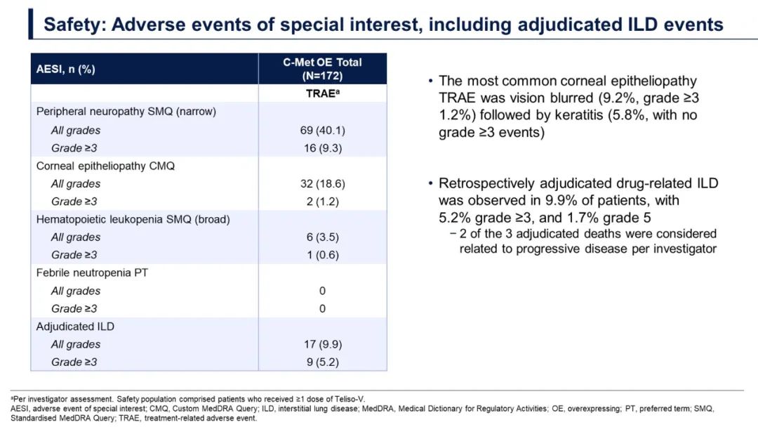 The study looked in patients who were EGFR wildtype with non-squamous histology in the second-or third-line setting.The headlines were that everybody to get into the study had to have either intermediate or high Met expression,which together represent about 25%of that lung cancer population.The response rate was higher if you had high Met-something like 34%versus around 22%for the intermediate-but the progression-free survival was very similar-about six months for both arms.The overall survival was also very similar at about 14-15 months.The toxicities were mostly dominated by peripheral neuropathy,which was a late onset side effect,reflecting cumulative exposure in patients who were actually deriving long-term benefit from the drug,and to some extent,interstitial lung disease.There were actually three deaths attributed to interstitial lung disease.The overall rate of interstitial lung disease was 9.9%.So this happened with antibody-drug conjugates,so we have to use them with caution and to recognize interstitial lung disease early and act on it.But this is a drug that works.