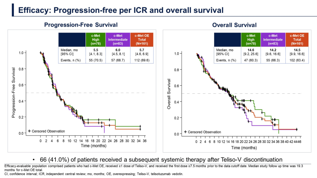 LUMINOSITY研究观察了二线或三线治疗中非鳞状组织学类型、EGFR野生型NSCLC患者,最重要的信息是,每个参与研究的患者都必须具有中度或高度Met表达(在肺癌人群约占25%)。如果Met水平较高,则Teliso-V的治疗反应率会更高,大约为34.6%(中等表达患者的ORR为22.9%);但无进展生存期非常相似,中等表达组和高表达组均为约6个月;总生存期也非常相似,两组皆约为14-15个月。