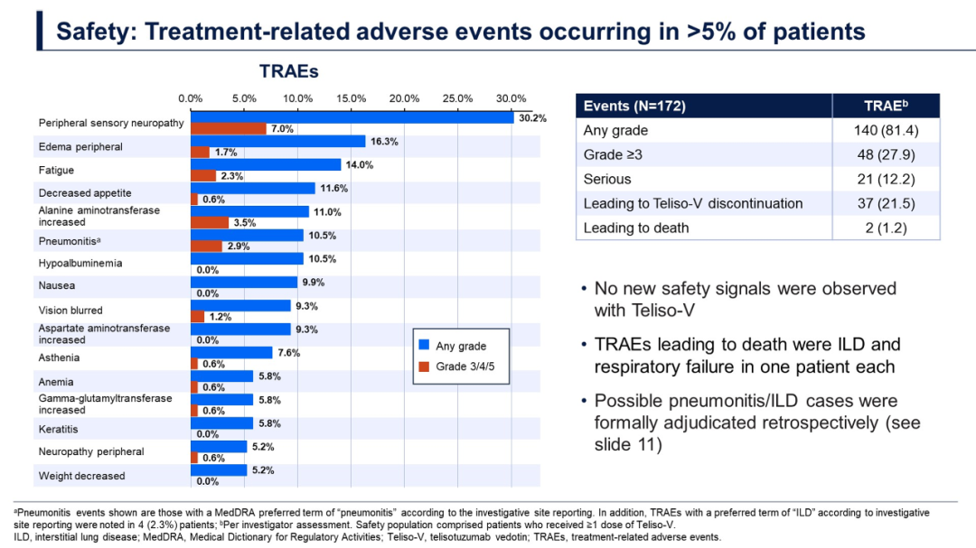 Teliso-V的毒性主要以周围感觉神经病变为主,这是一种迟发性副作用,反映了剂量累积对于从药物治疗中获得实际长期获益患者的影响;还有某种程度上的间质性肺疾病(ILD),有三例死亡归因于ILD,ILD总体发生率为9.9%。综上,ADC药物也发生了这种程度ILD,用药时应谨慎,需要尽早识别ILD并采取处理措施。但总体而言,Teliso-V是一种有效的药物。
